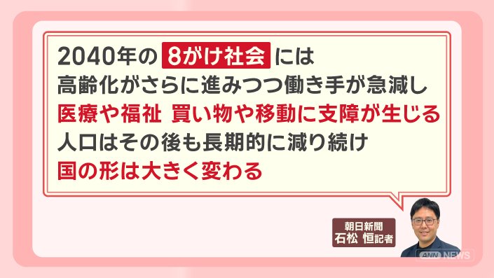 「2040年の『8がけ社会』には高齢化がさらに進みつつ、働き手が急減し、医療や福祉、買い物や移動に支障が生じる。人口はその後も長期的に減り続け、国の形は大きく変わる」