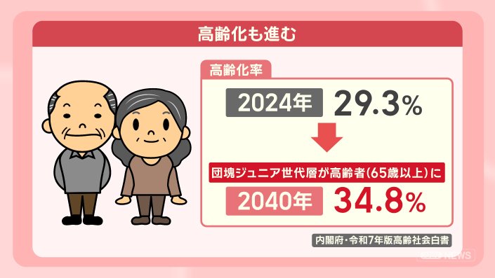 また、高齢化も進み、高齢化率は2024年で29.3%でしたが、団塊ジュニアが高齢者となる2040年には34.8%に達する見込みです。