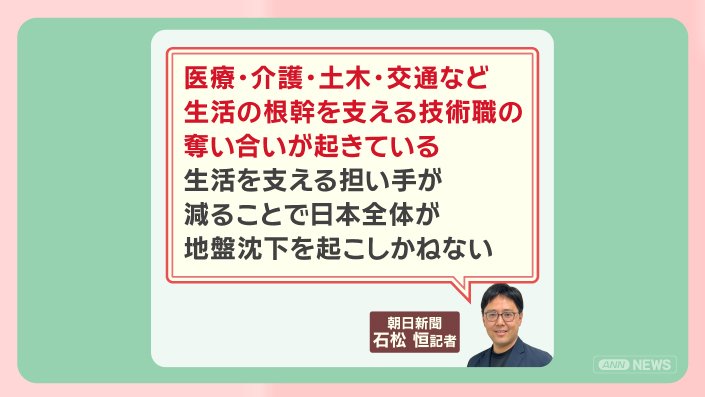 「医療・介護・土木・交通など生活の根幹を支える技術職の奪い合いが起きている。生活を支える担い手が減ることで日本全体が地盤沈下を起こしかねない」