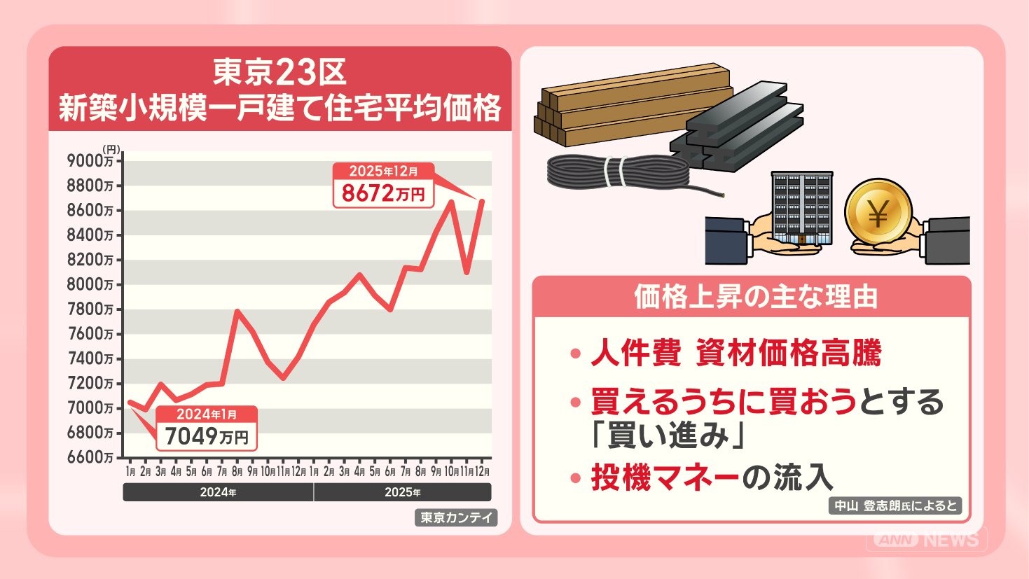 東京23区の新築小規模一戸建て住宅の平均価格は、2024年1月に7049万円でしたが、2025年12月には8672万円と、2年で1500万円以上上がっています。