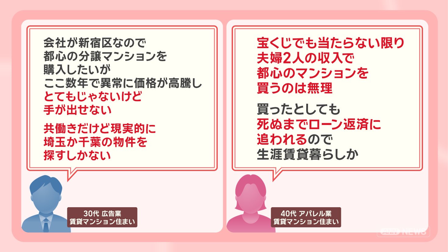 「会社が新宿区なので、都心の分譲マンションを購入したいが、ここ数年で異常に価格が高騰し、とてもじゃないけど手が出せない。共働きだけど、現実的に埼玉か千葉の物件を探すしかない」