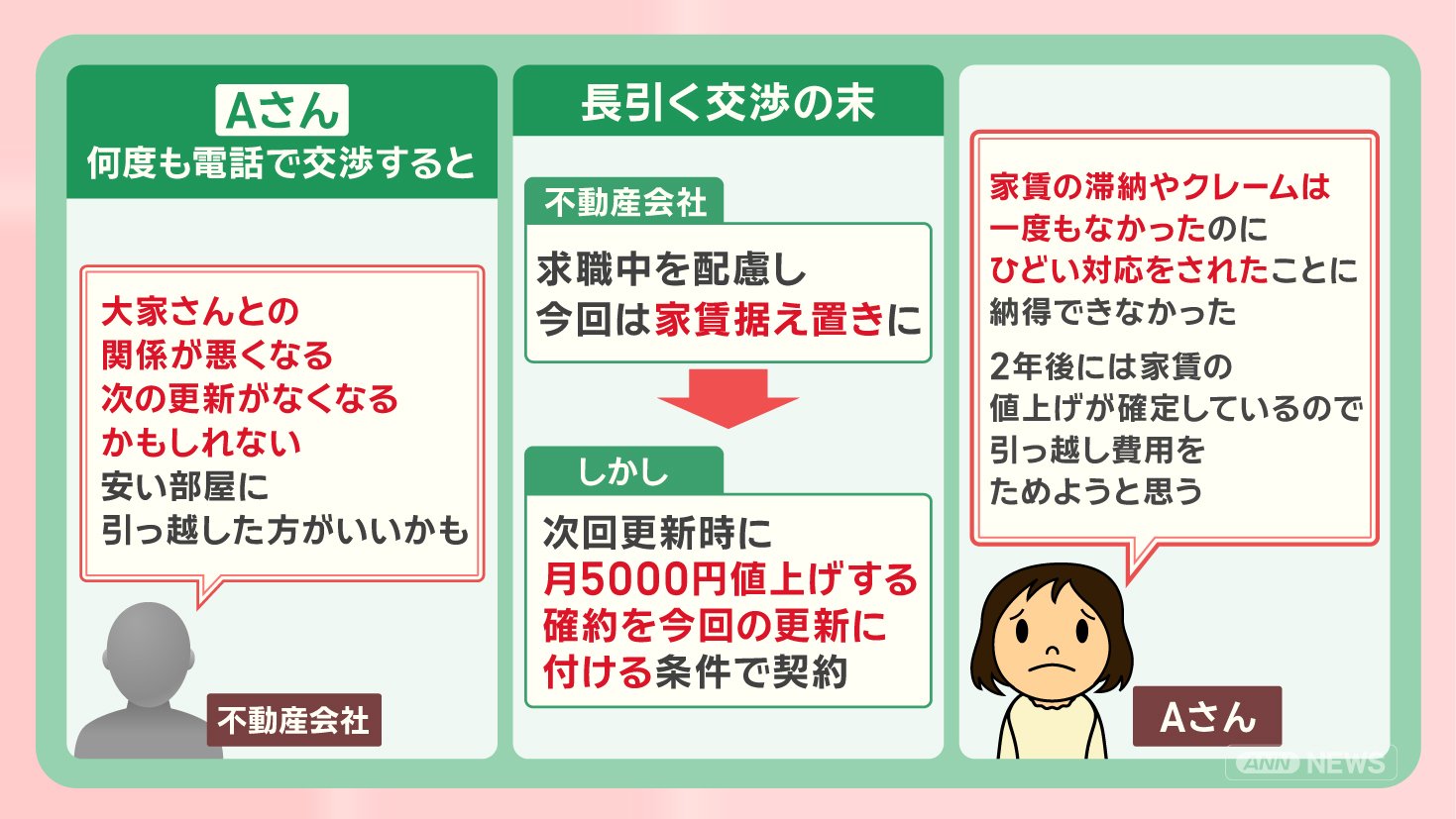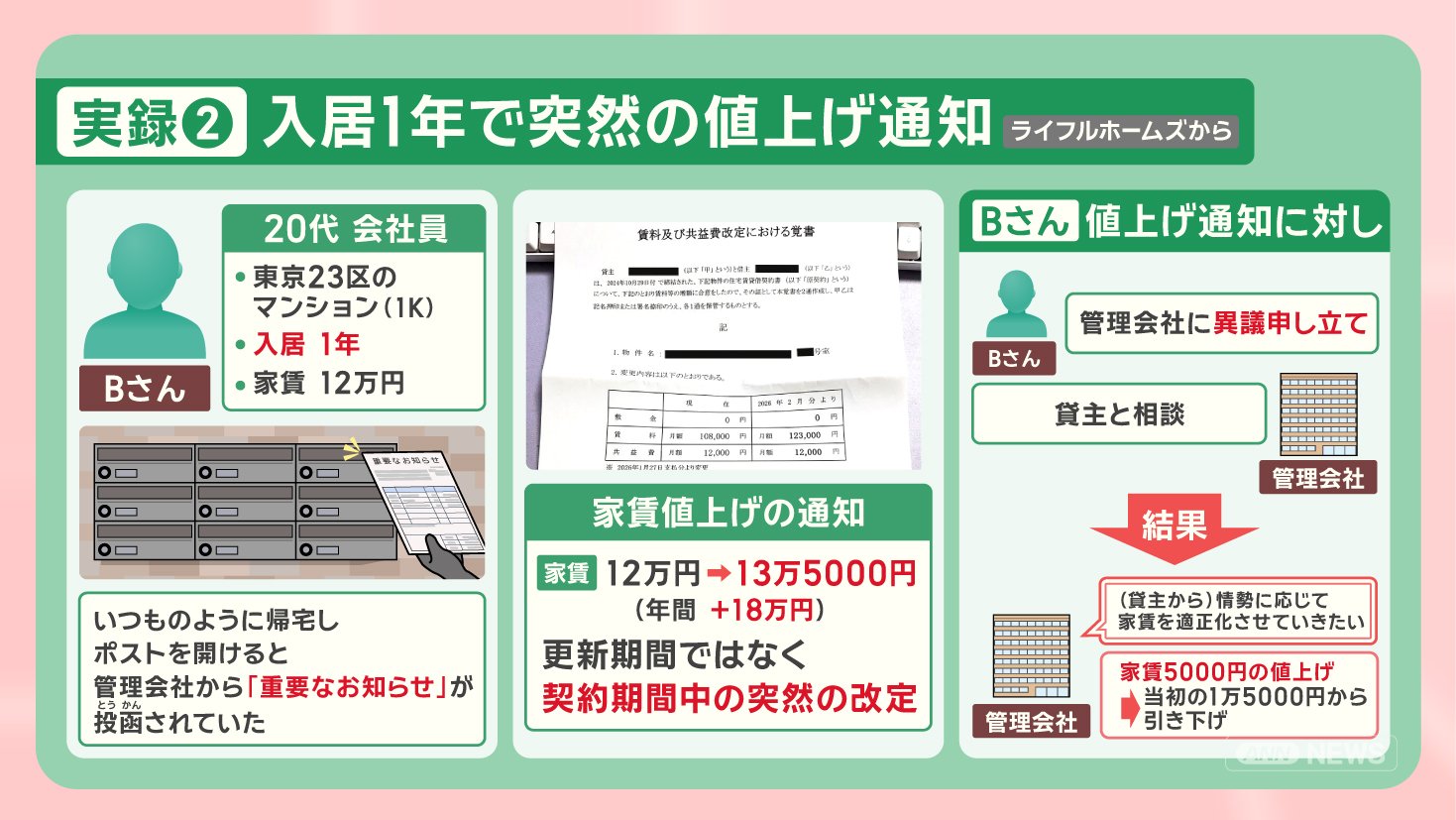「家賃の滞納やクレームは一度もなかったのに、ひどい対応をされたことに納得できなかった。2年後には家賃の値上げが確定しているので、引っ越し費用をためようと思う」と話しています。