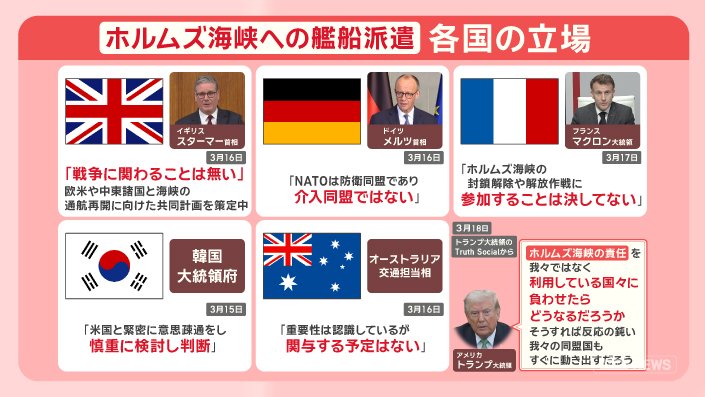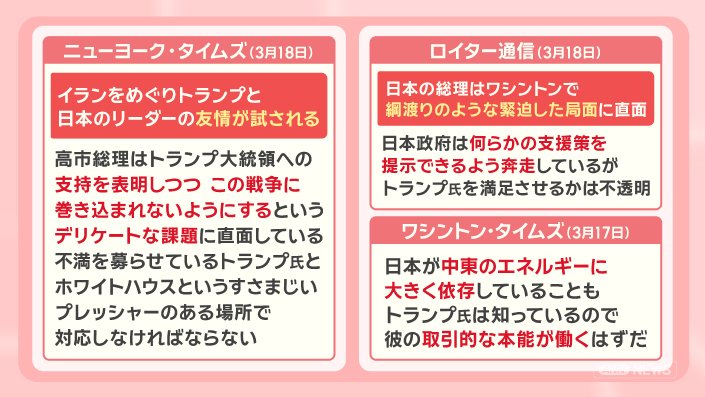 『高市総理は今、トランプ大統領への支持を表明しつつ、この戦争に巻き込まれないようにするという、デリケートな課題に直面している。不満を募らせているトランプ氏とホワイトハウスというすさまじいプレッシャーのある場所で、対応をしなければならない』と報じました。