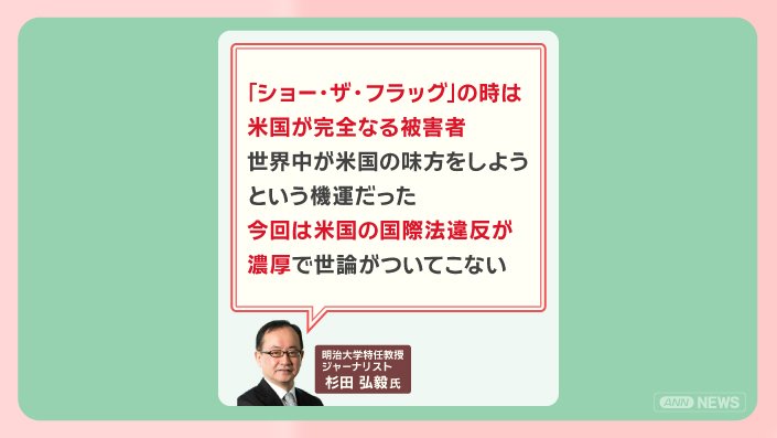 「『ショー・ザ・フラッグ』の時はアメリカが完全なる被害者。世界中がアメリカの味方をしようという機運だった。今回はアメリカの国際法違反が濃厚で世論がついてこない」