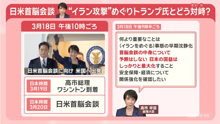 3月18日午後10時ごろ、高市総理が日米首脳会談に向け、アメリカへ出発しました。