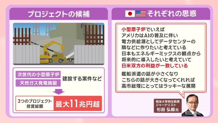 「小型原子炉でいえば、アメリカは、AI(人工知能)の普及に伴い、電力供給源としてデータセンターの隣などに作りたいと考えている。日本もエネルギーミックスの観点から将来的に導入したいと考えていて、日米双方の利益が一致している。艦船派遣の話が小さくなり、こちらの話が大きくなってくれれば高市総理にとってはラッキーな展開」