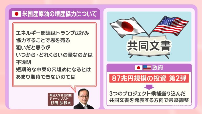 日米両政府は、87兆円規模の投資の第2弾として、3つのプロジェクト候補を盛り込んだ共同文書を発表する方向で最終調整しています。