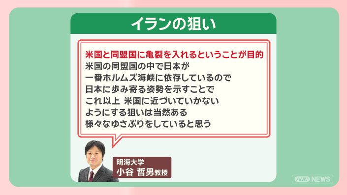 「アメリカと同盟国に亀裂を入れるということが目的。アメリカの同盟国の中で、日本が一番ホルムズ海峡に依存しているので、日本に歩み寄る姿勢を示すことで、これ以上アメリカに近づいていかないようにする狙いは当然ある。様々なゆさぶりをしていると思う」