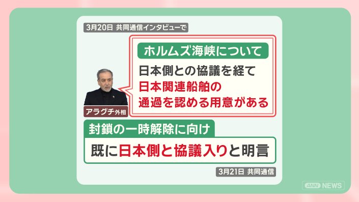 「日本側との協議を経て、日本関連船舶の通過を認める用意がある」として封鎖の一時解除に向けて、既に日本側と協議に入ったと明言しました。