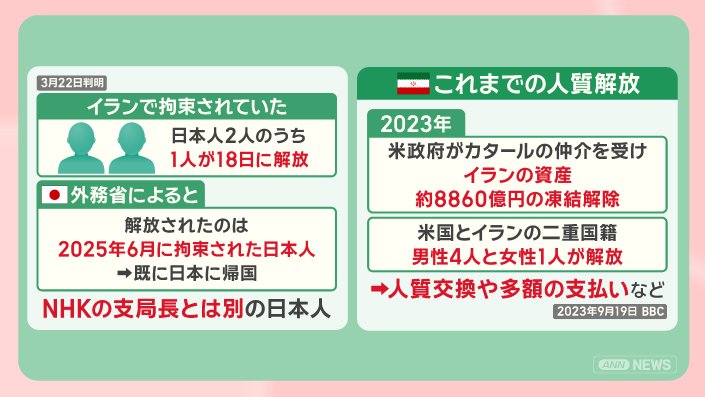 イランで拘束されていた日本人2人のうち、1人が3月18日に解放されたということです。