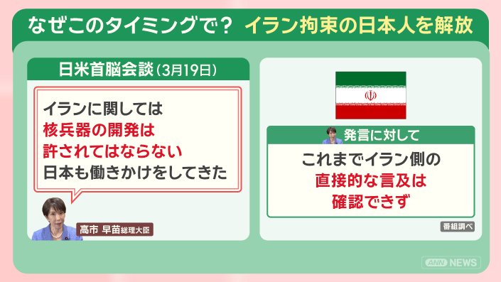 このタイミングで、イランで拘束されていた日本人が解放されました。
