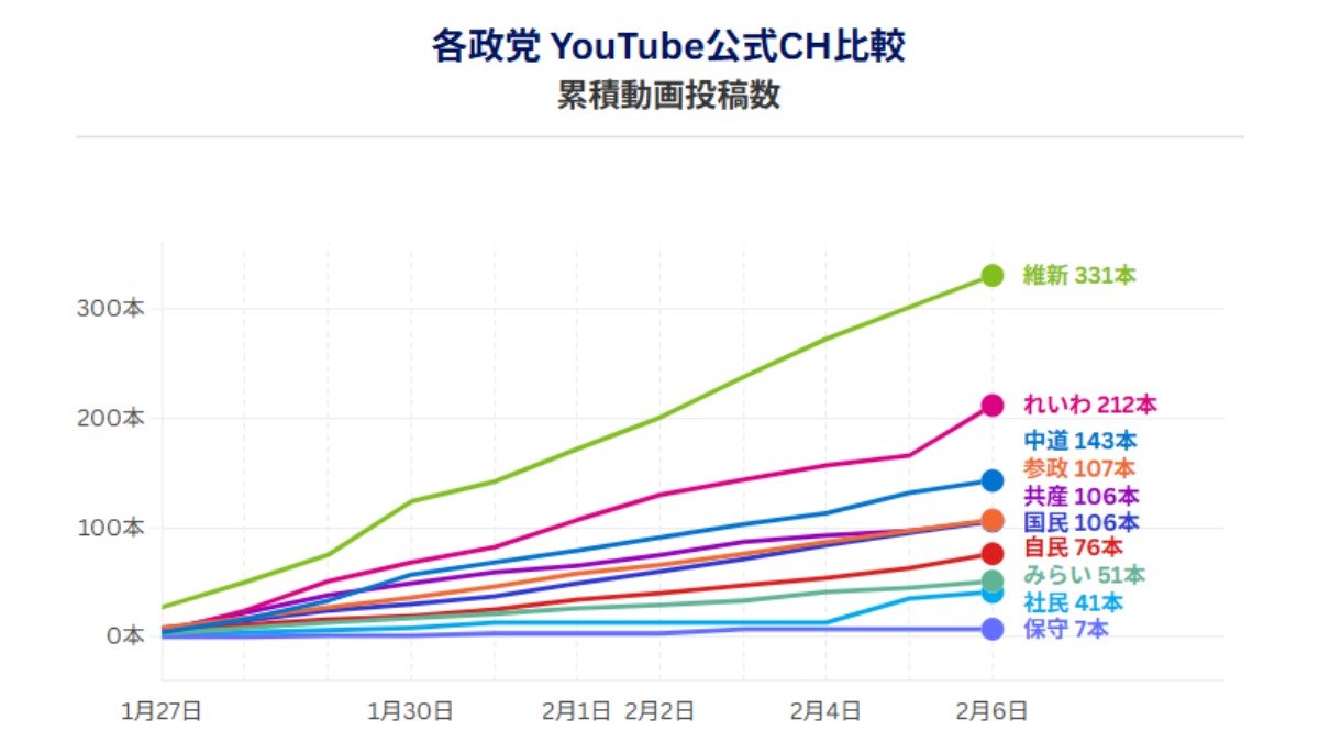 各政党YouTube公式CH累積動画投稿数(データ協力:NTTドコモビジネスX、調査期間:1月27日―2月6日)