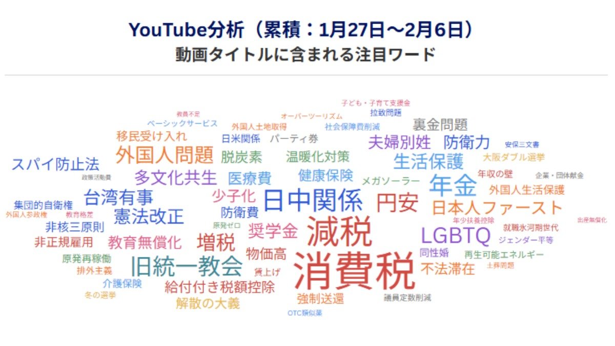 YouTube動画タイトルに含まれる注目ワード(データ:YouTube APIを用いてベストエフォートで取得、調査期間:1月27日―2月6日、監修:立命館大学 谷原つかさ准教授)