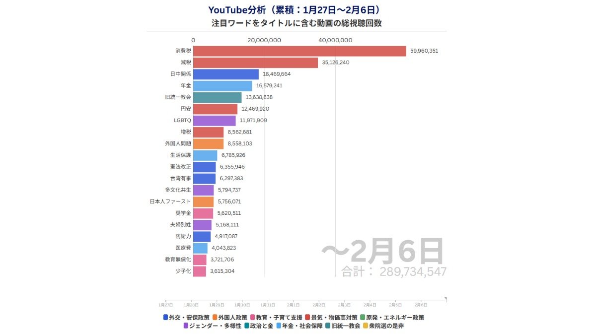 注目ワードをタイトルに含むYouTube動画の総視聴回数(データ:YouTube APIを用いてベストエフォートで取得、調査期間:1月27日―2月6日、監修:立命館大学 谷原つかさ准教授)
