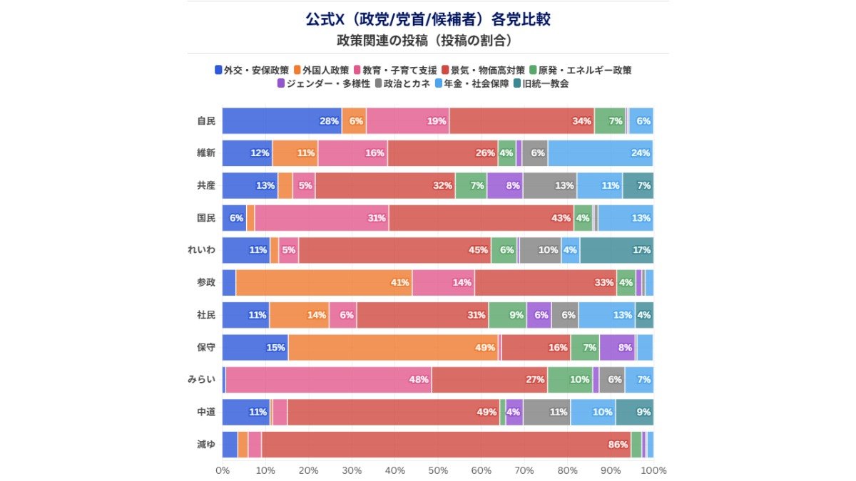 政党・党首・候補者の公式X 政策関連の投稿割合(データ協力:NTTドコモビジネスX / Meltwater、調査期間:1月27日―2月5日)