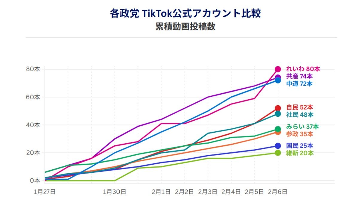 各政党TikTok公式アカウント累積動画投稿数(データ協力:NTTドコモビジネスX、調査期間:1月27日―2月6日)