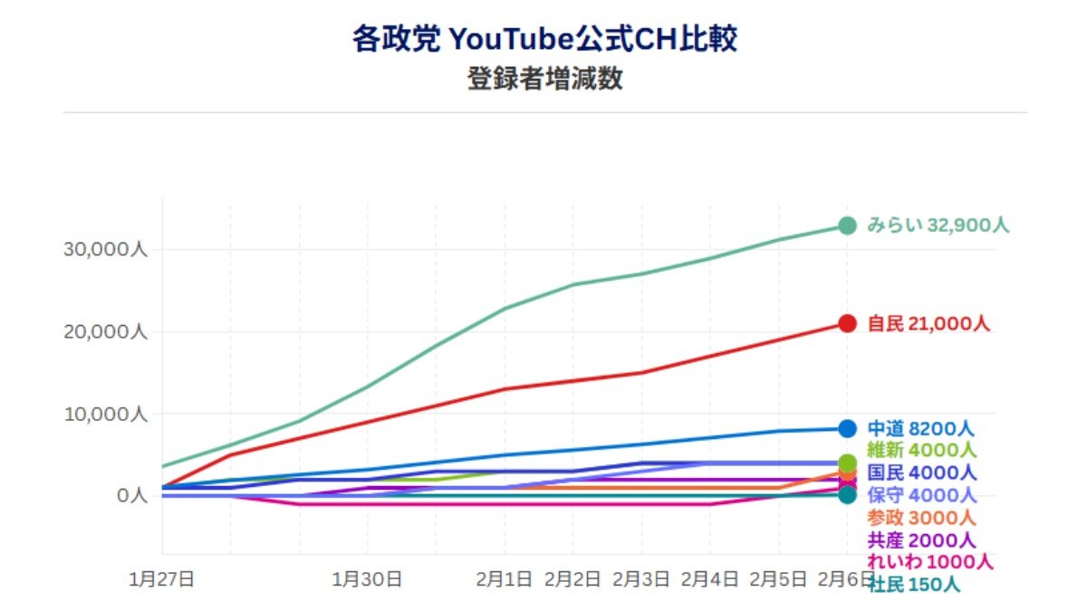 各政党YouTube公式CH登録者増減数(データ協力:NTTドコモビジネスX、調査期間:1月27日―2月6日)