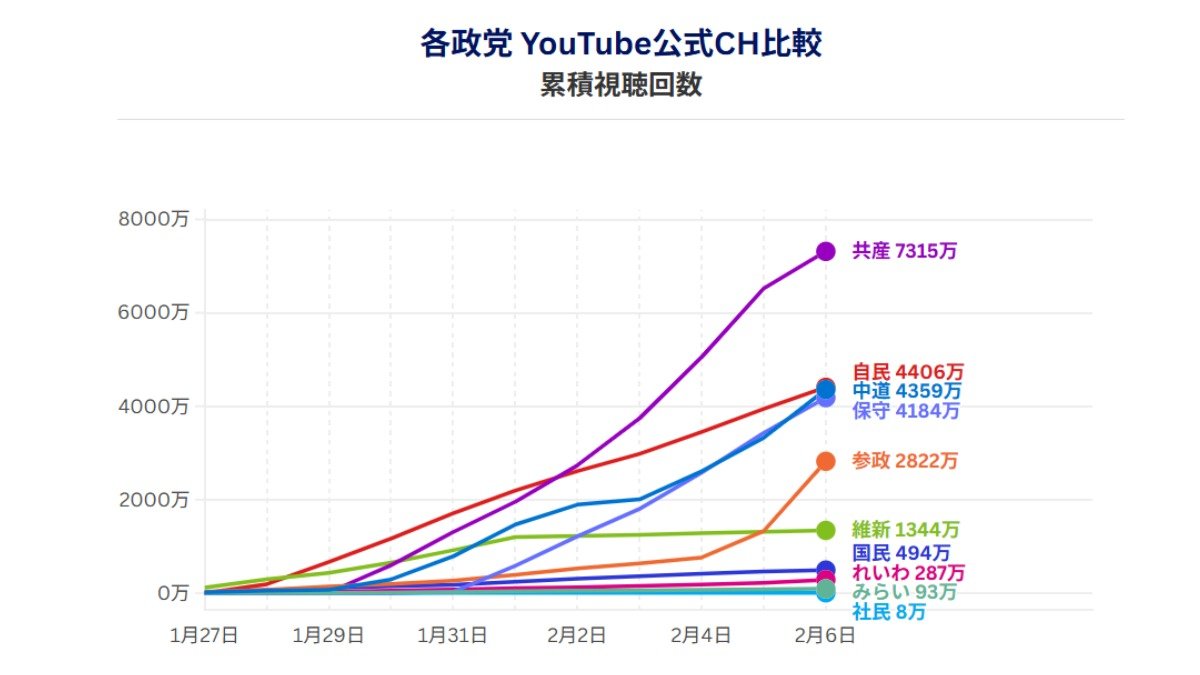 各政党YouTube公式CH累積視聴回数(データ協力:NTTドコモビジネスX、調査期間:1月27日―2月6日)