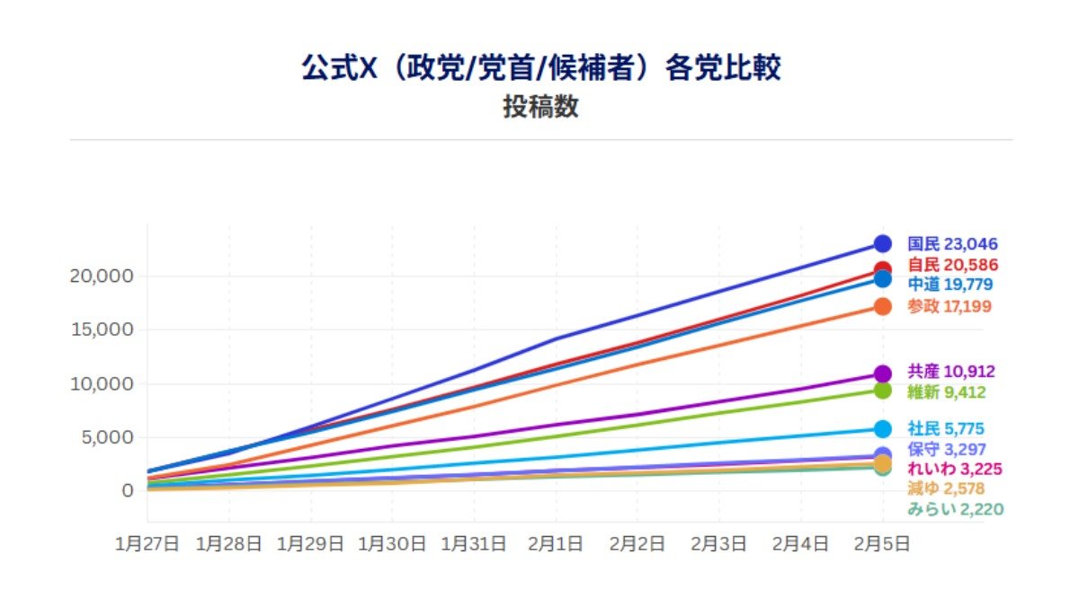 X全量分析 政党に関連するワードを含む投稿数(データ協力:NTTドコモビジネスX / Meltwater、調査期間:1月27日―2月5日)