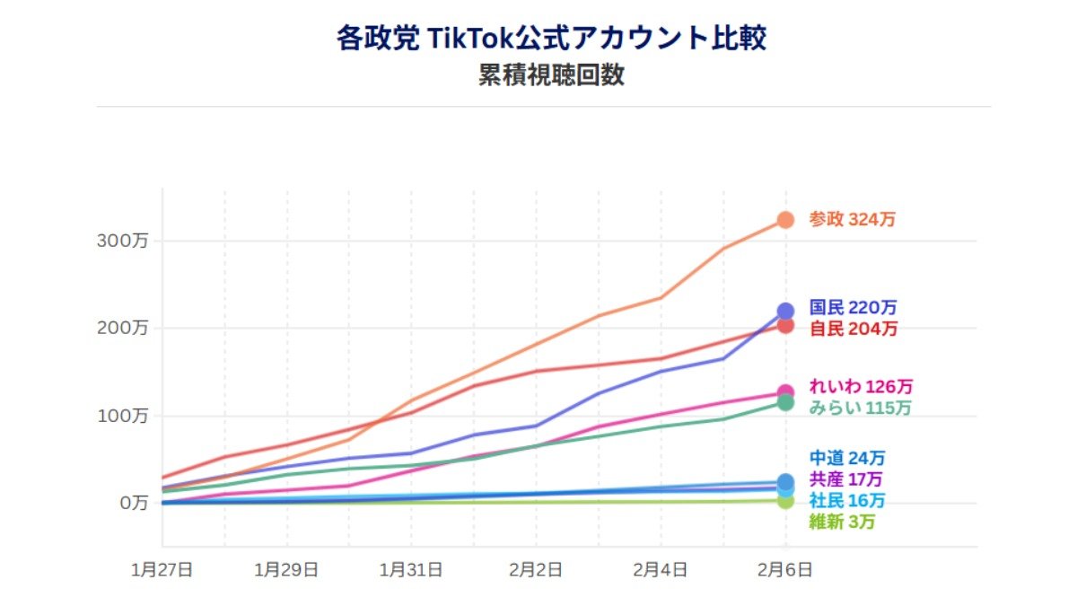 各政党TikTok公式アカウント累積視聴回数(データ協力:NTTドコモビジネスX、調査期間:1月27日―2月6日)