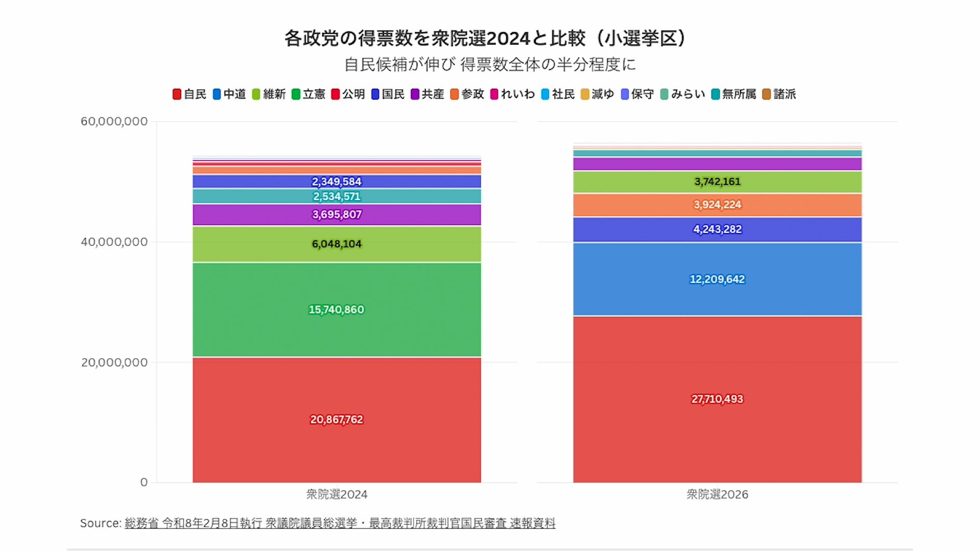 各政党の得票数を衆院選2024と比較(小選挙区)