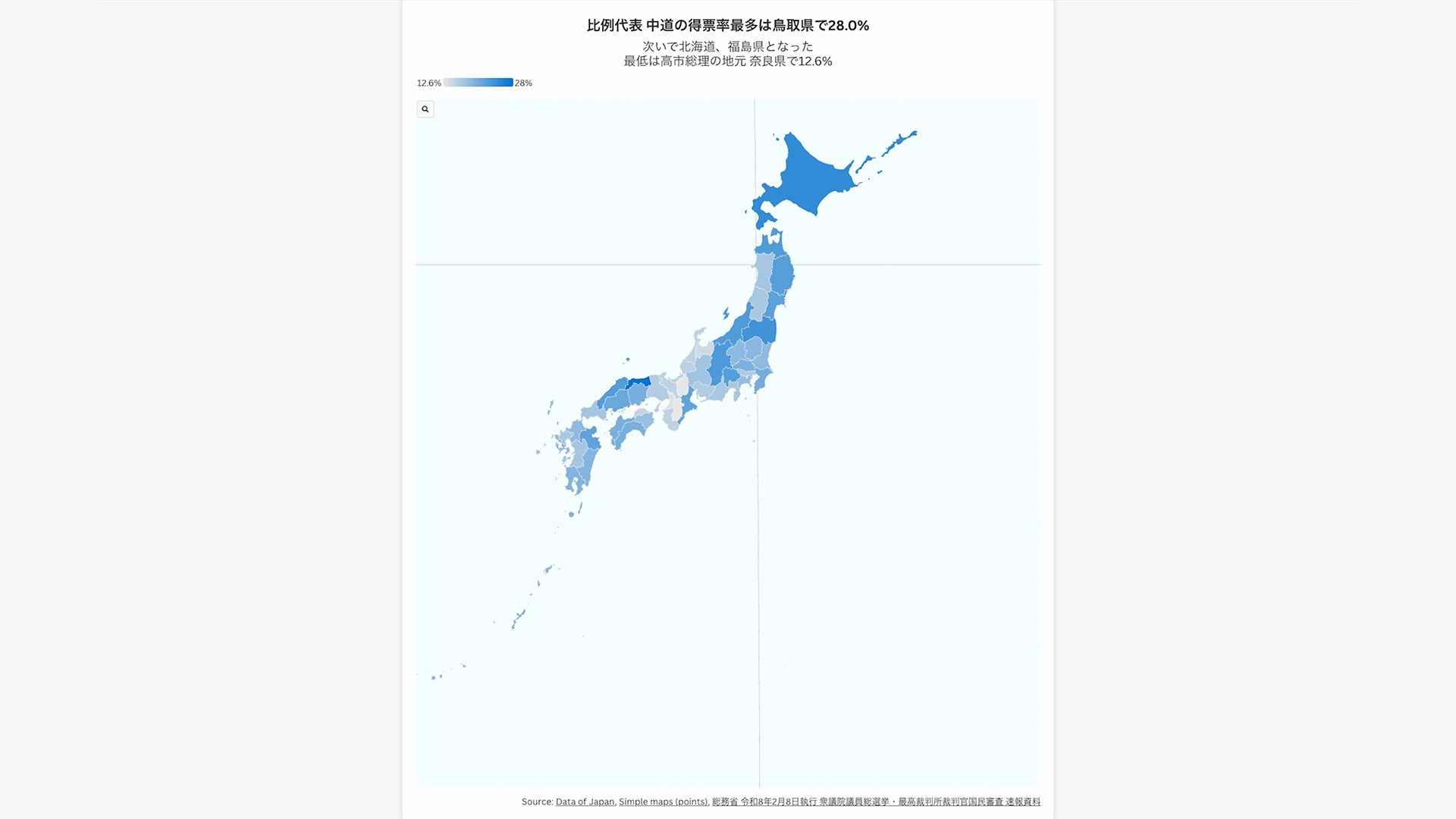 比例代表 中道の得票率最多は鳥取県で28.0%