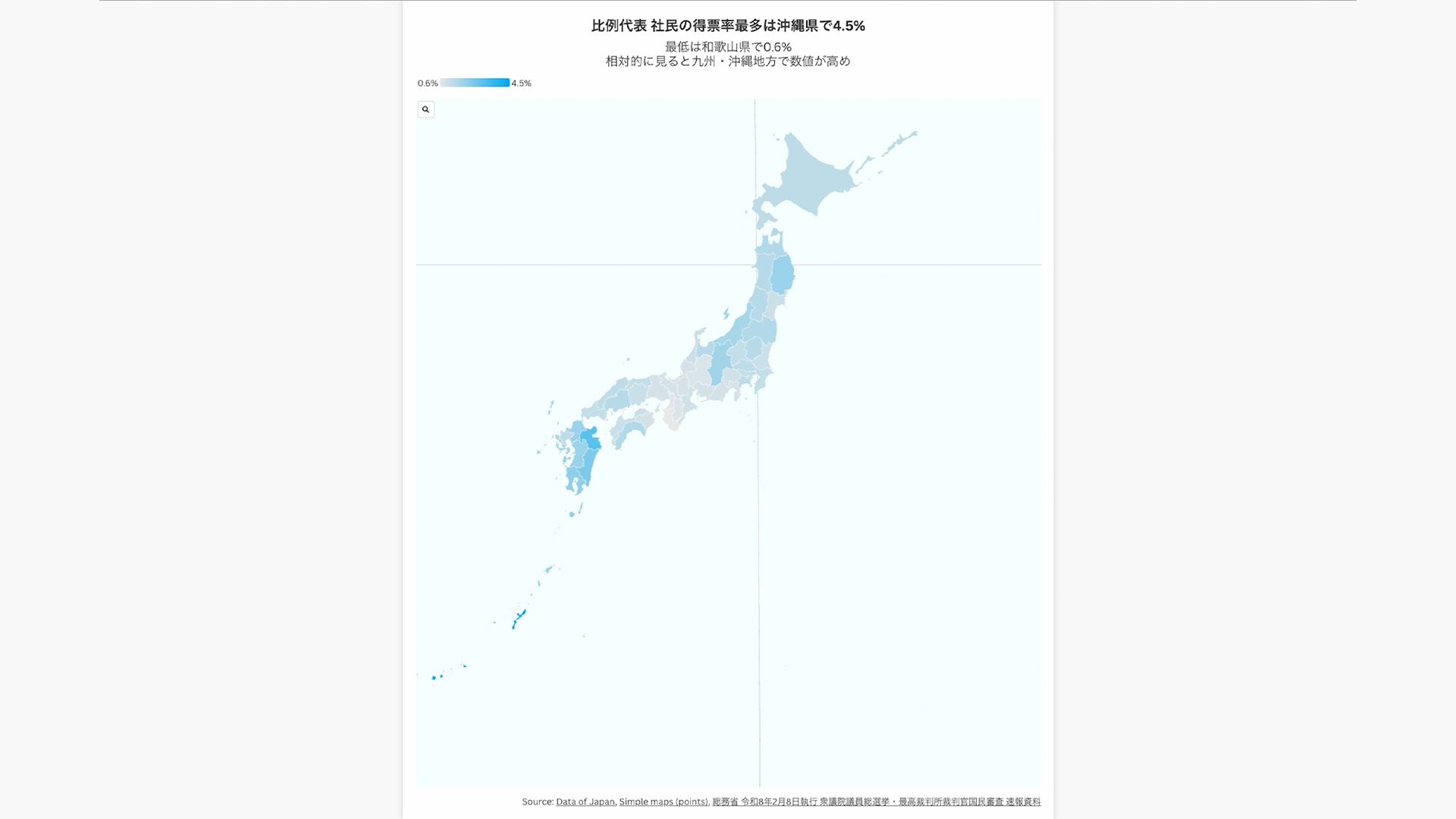 比例代表 社民の得票率最多は沖縄県で4.5%