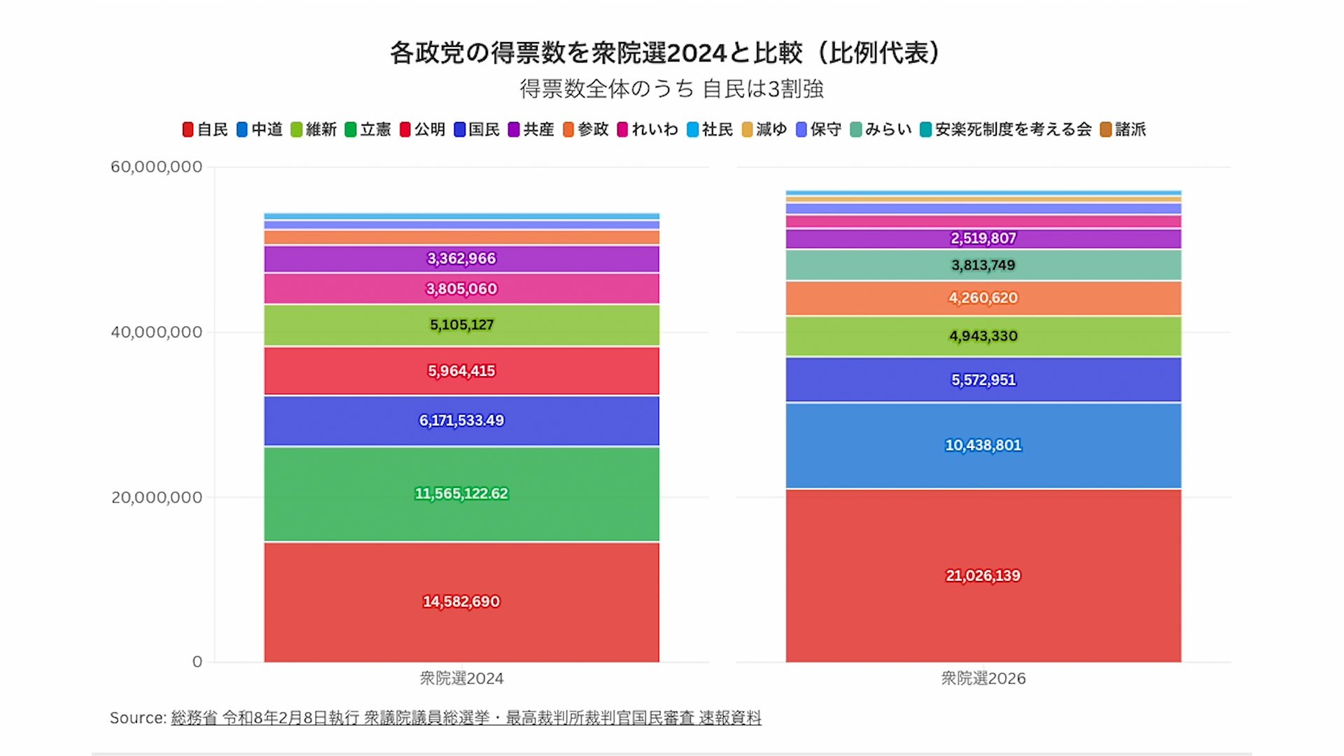 各政党の得票数を衆院選2024と比較(比例代表)