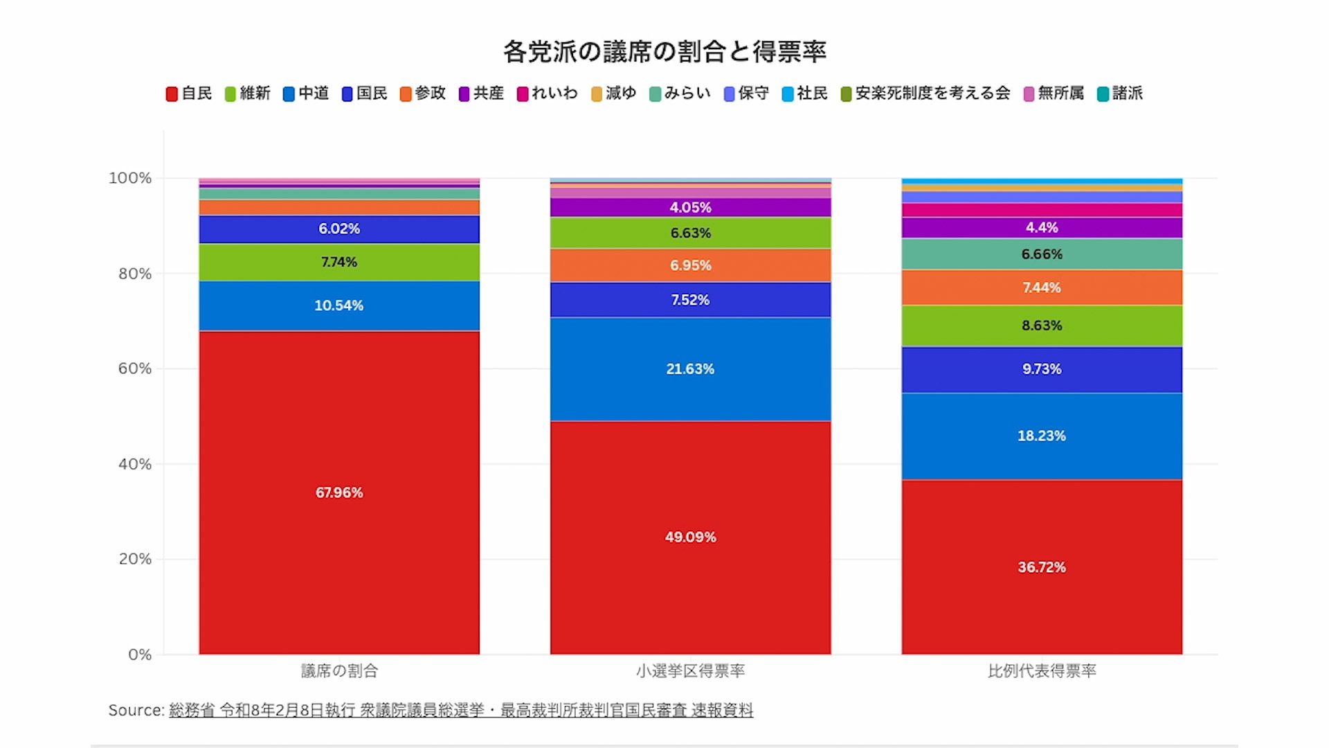 各党派の議席の割合と得票率
