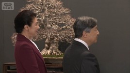 天皇ご一家 盆栽の展覧会をご覧に 推定樹齢約400年の五葉松も 信子さまが案内