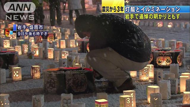 東日本大震災からまもなく3年。岩手県の陸前高田市や盛岡市では、震災の犠牲者を追悼しようと灯籠(とうろう)に明かりがともされました。