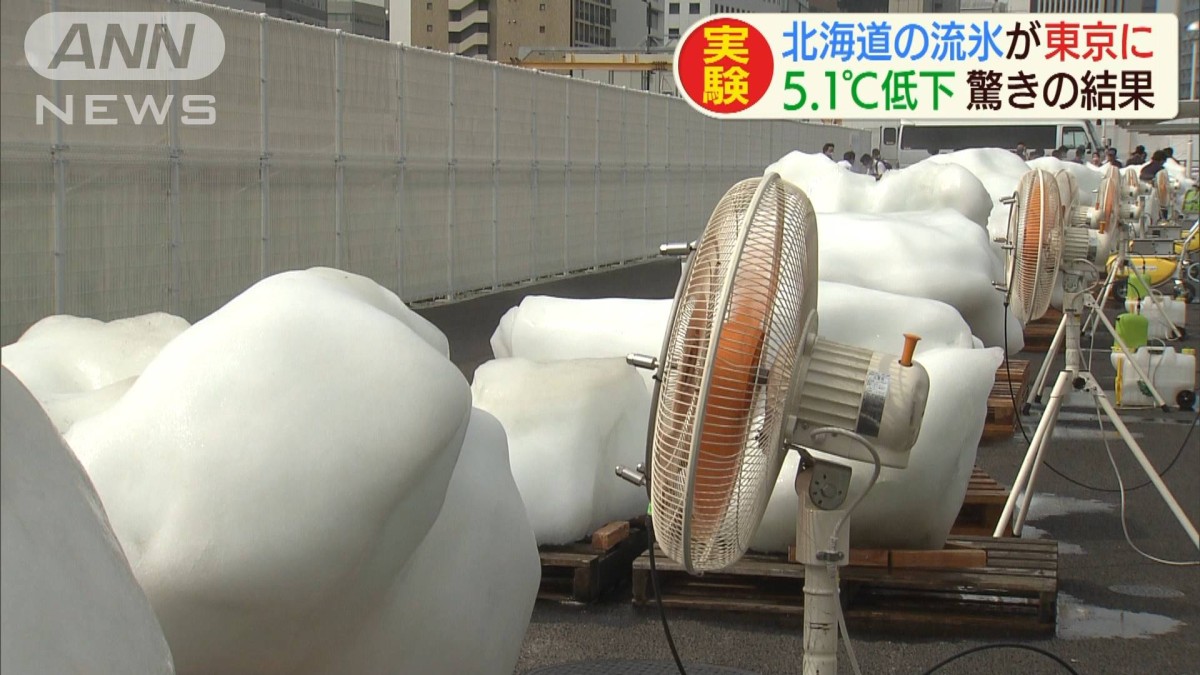 武井さんの前にある白い大きな物体は北海道に漂着した流氷です。東京のJR高輪ゲートウェイ駅前ではイベント会場に設置した流氷に風を送り、周囲の気温がどの程度下がるかを測定する実証実験が行われました。実験前、35.2度だった会場は風を送り始めると5.1度下がり、30.1度になりました。7日の実験には流氷約35トンが使われました。実験の結果などを参考に来年以降の実用化を目指しているということです。