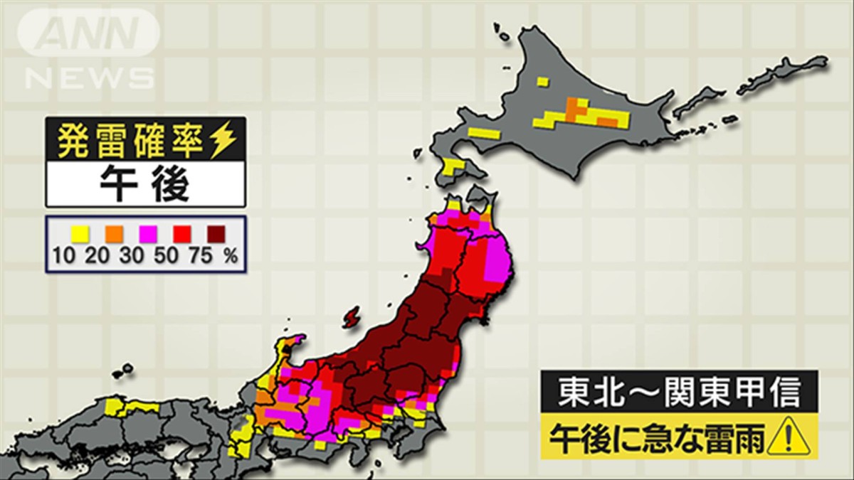 きょう(2日)は関東〜東北で大規模な雷雨の恐れがあります。