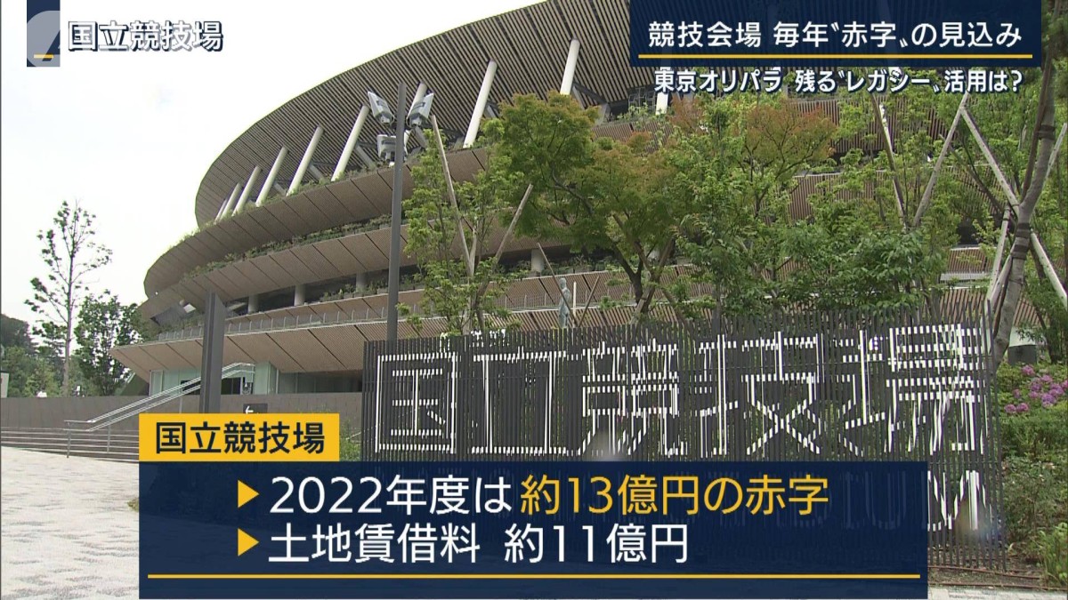 収支を見てみると、例えば国立競技場は2022年度だけで、維持管理費などで約13億円の赤字の見通し。さらに、土地の賃借料も11億円ほどかかります。