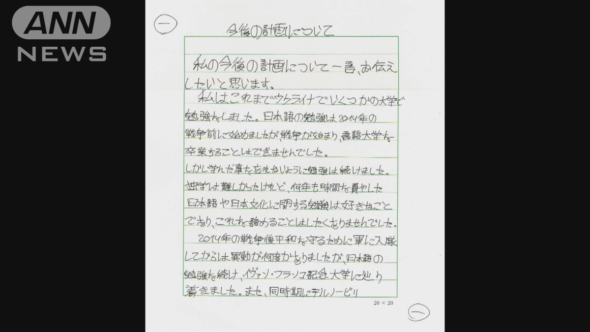 アントン・コルニシュクさん直筆メッセージ原文:「今後の計画について」私の今後の計画について一言、お伝えしたいと思います。私はこれまでウクライナでいくつかの大学で勉強をしました。日本語の勉強は2014年の戦争前に始めましたが、戦争がはじまり、言語大学を卒業することはできませんでした。しかし学んだことを忘れないように勉強は続けました。独学は難しかったけれど、何年も時間を費やした日本語や日本文化に関する勉強は好きなことであり、これを諦めることはしたくありませんでした。2014年の戦争後、平和を守るために軍に入隊してからは異動が何度かありましたが、日本語の勉強を続け、イヴァン・フランコ記念大学に辿り着きました。また、同時期にテルノーピリ国立医学大学に入学し救急医療を専攻しています。なぜなら2019年に始まったロシアとの戦争は今後長く続き、自分は基礎的な医学専門知識が必要だと感じたからです。医学専門知識があれば、もっと効果的に自分の国を守ることができます。私は軍においては衛生兵ですが、2つの大学での勉強も続けています。勉強との両立は大変ですが、勉強は非常に面白いです。ロシアが全面戦争を仕掛けた2022年2月24日、私は前線に再び戻らなくてはならないとすぐに理解しました。そして、キーウ郊外のイルピンで負傷し、2か月間ウクライナで救急措置の後、日本で治療を試みる決心をして今日に至ります。私はリハビリを終えて、また任務に着く準備ができたら、侵略者との戦いに勝利に貢献するためにウクライナに戻りたいです。それまでの日本滞在中には、日本語の勉強と日本人との交流を通じて日本語能力を高めたいと思います。また他のウクライナ退避民や日本に長く住んでいるウクライナ人達とも会ってみたいです。日本で私ができることとして、ウクライナ人支援のコーディネートや、戦争で負傷した人々のリハビリ事業についてもお手伝いすることができます。また、ウクライナに関する客観的な現状を日本人に伝えたいと思います。この観点から皆さまに協力頂ければ幸いです。今、この場にいられること、モラル面や経済面における多大な支援に感謝します。ウクライナ国民を代表して日本の方々に心からの感謝を述べたいと思います。いつの日か私たちも皆様にお返しをできることを希望しています。2022年8月26日アントン・コルニシュク」