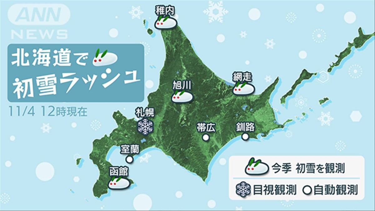 4(金)12時現在で、旭川、網走、函館と初雪が観測されています。