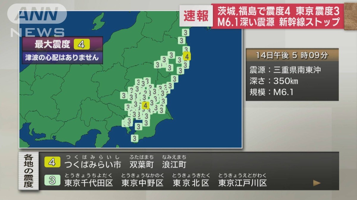 気象庁によりますと、午後5時9分ごろ、三重県南東沖を震源とする地震がありました。この地震で福島県浜通りで最大震度4を観測しました。