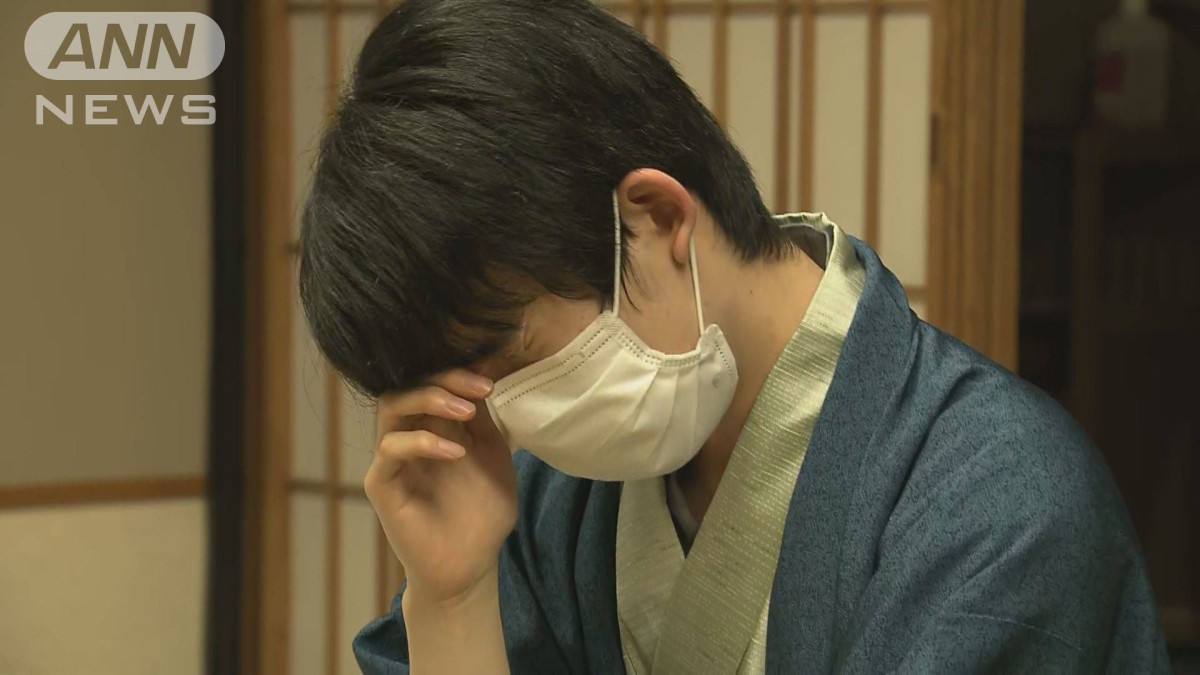 お茶を飲んだ藤井五冠がガクッと首を折る。はっきりと負けを認識した瞬間。