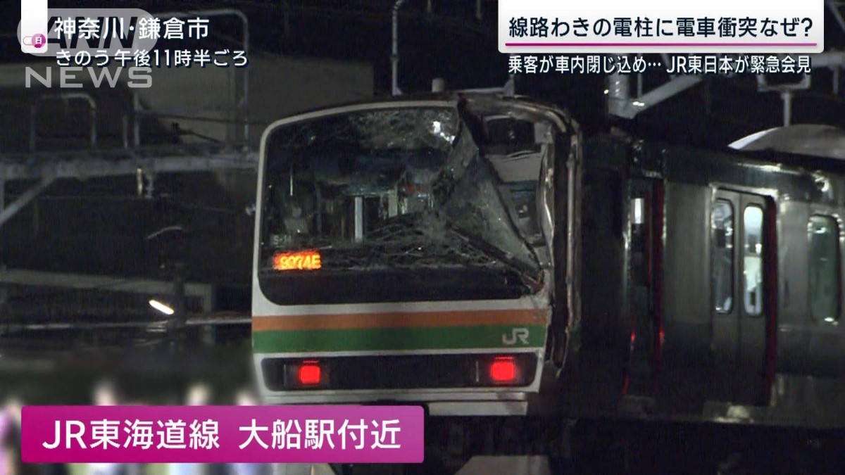 JR東日本によると、きのう5日午後9時半頃、JR東海道線の線路わきに立つ電柱が傾き、走行してきた電車と衝突。乗客がおよそ1時間、車内に閉じこめられました。この事故の影響で乗客3人がけがをし、9人が体調不良を訴えたということです。