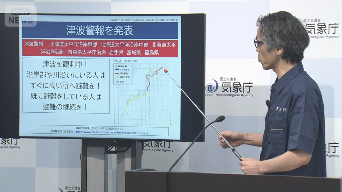 気象庁はカムチャツカ半島付近を震源とするマグニチュード8.7の地震を受けて30日午前9時40分、北海道から和歌山県の沿岸にかけて津波警報を発表しました。
