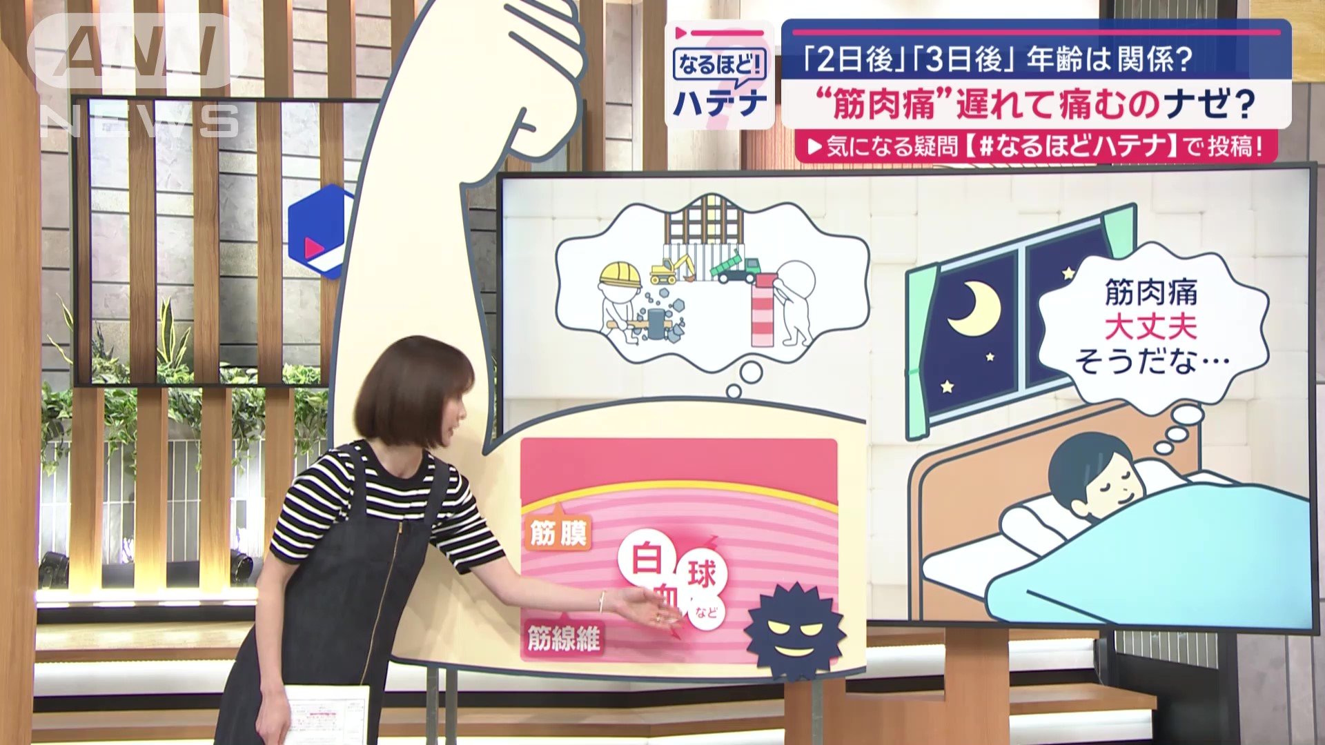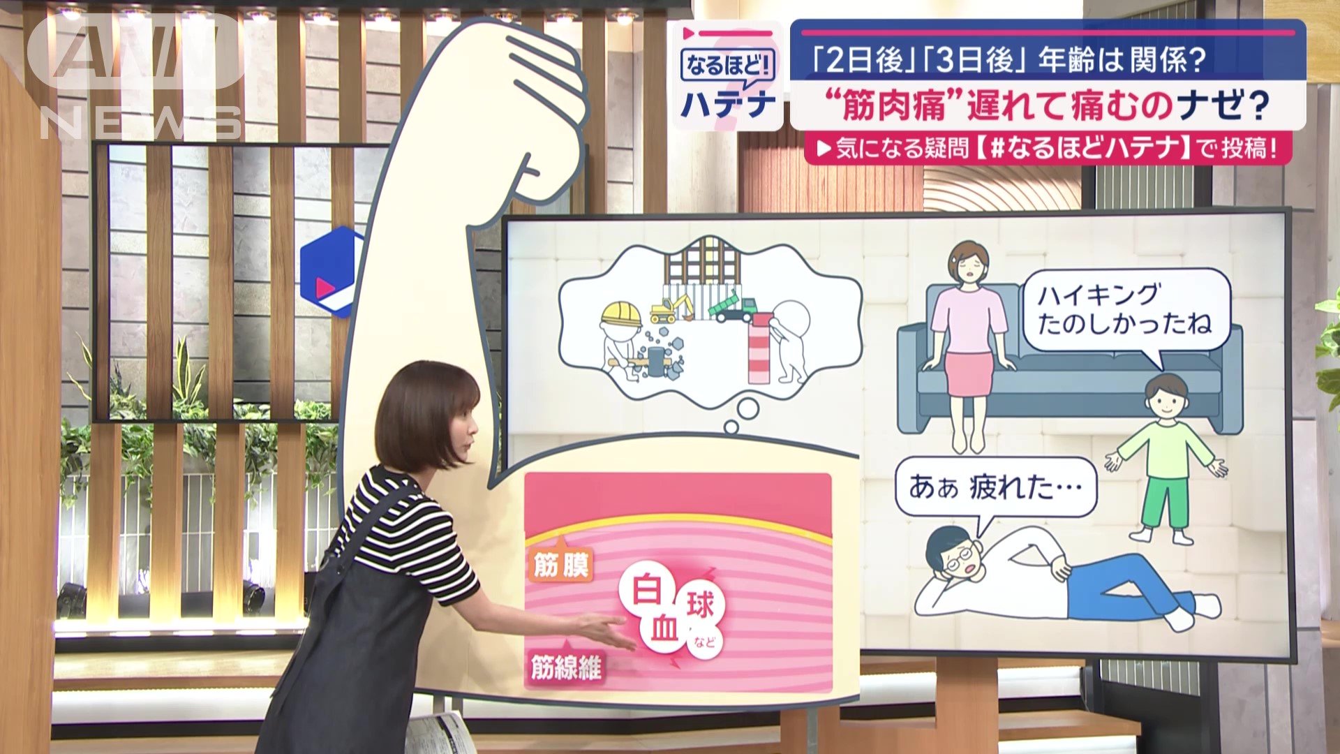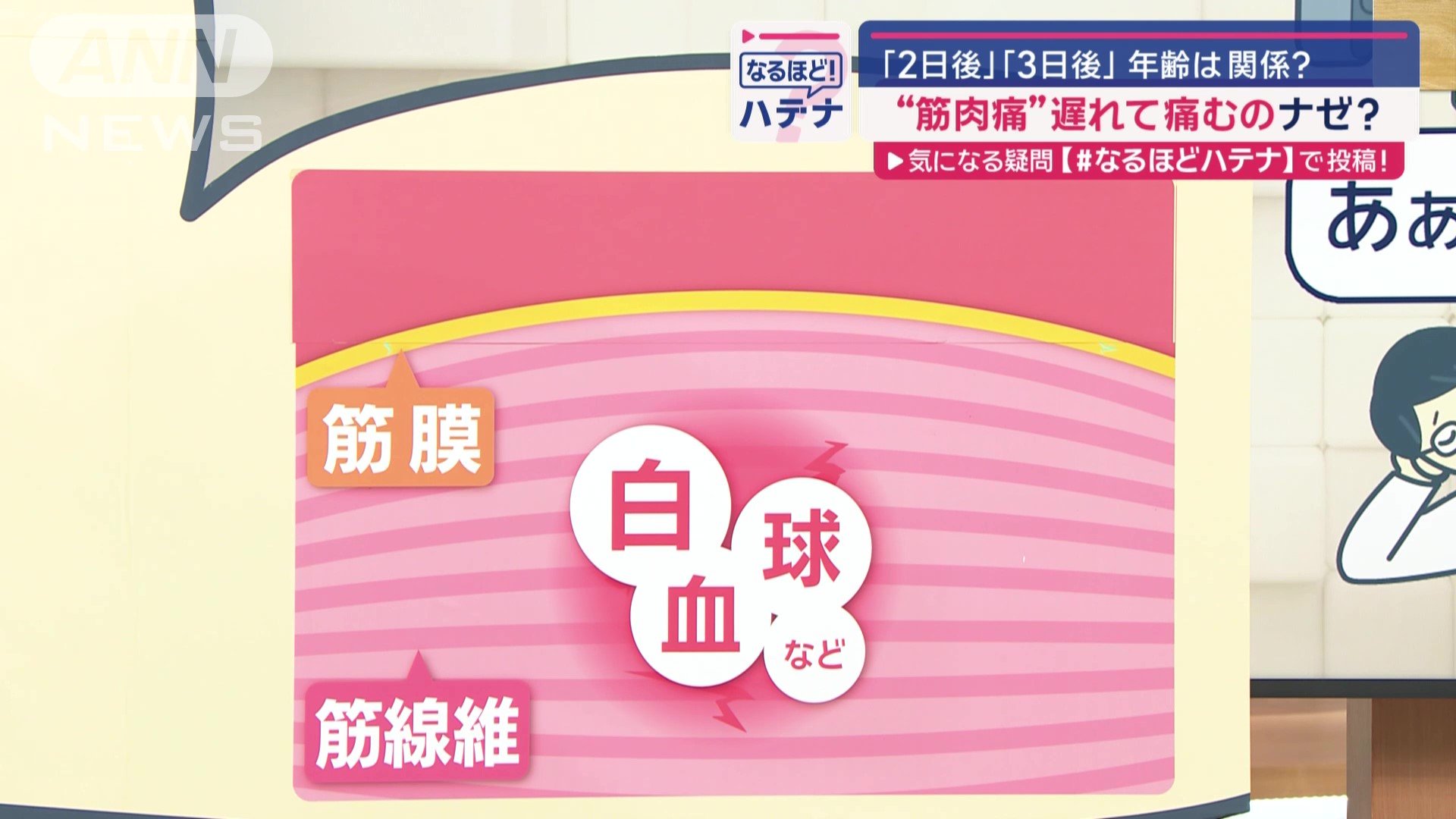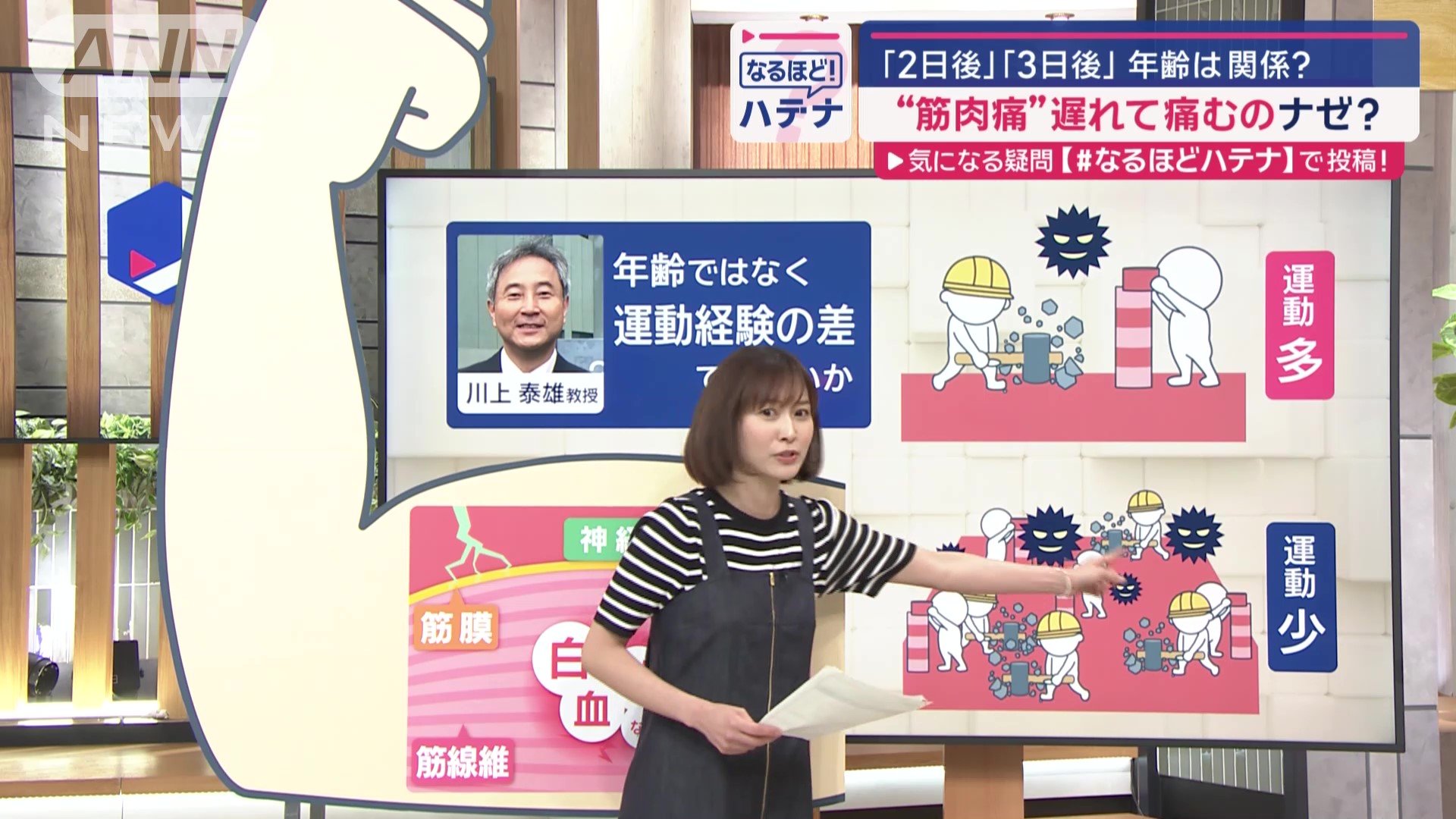 こちらもメカニズムが解明されていませんが、川上教授の考えでは「普段多く運動している人に比べて運動量が少ない人は、筋肉の修復作業の範囲が広くなる。そうなると作業も長引き刺激物質がたくさん発生。身体が慣れていないので作業スピードも遅い。筋肉痛も長引き、痛みのピークも後ろ倒しになっていく」ということです。