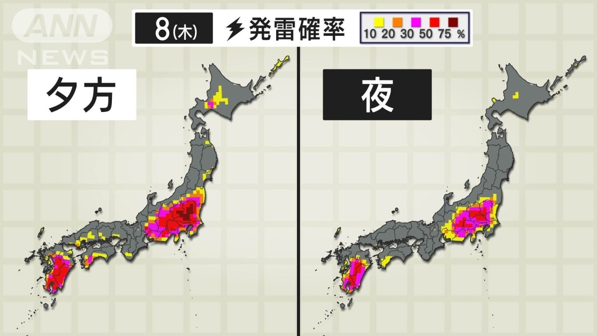 きょう8(木)も、大気の不安定な状態が続いています。夕方から夜にかけては、関東甲信や九州を中心に、雷の発生する確率が高くなっています。きのう7(水)ほど大規模なものにはならないとみていますが、局地的には道路が一気に冠水するような雨の降り方になりそうです。気象庁ウェブサイトの「雨雲の動き」などを使って、周囲の雨の降り方を確認し、安全に帰宅するようにしてください。