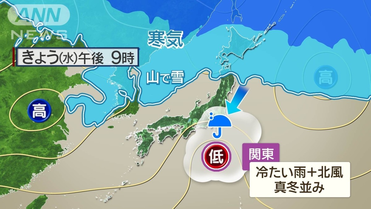 ただ、関東だけは違います。低気圧が近づき雨が降ったりやんだりの一日となりそうです。日差しが出ず、冷たい空気も入りやすい影響で日中も気温があがりません。予想最高気温は東京で8℃と、なんと真冬並みの寒さです。