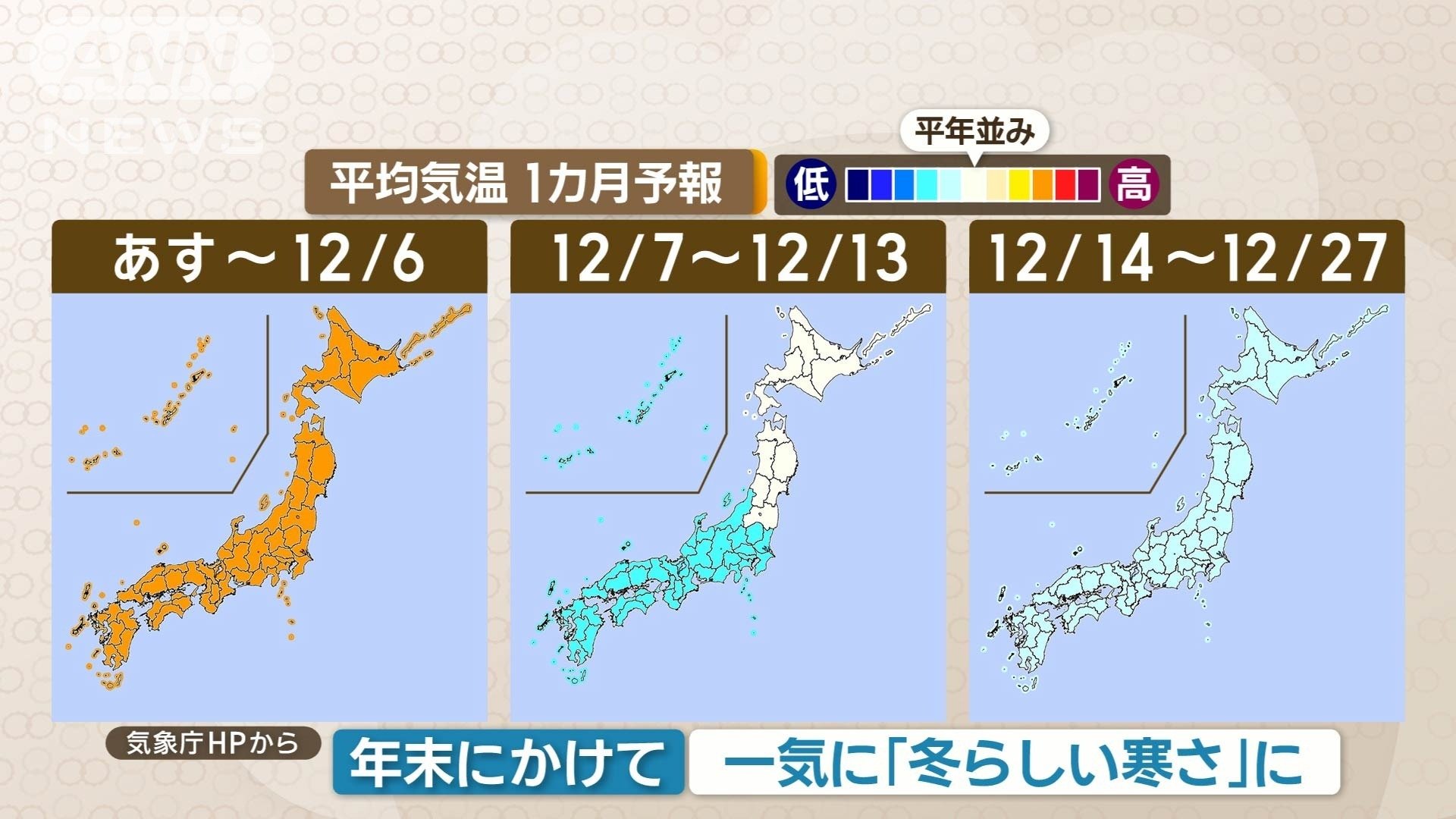 気象庁は28日、最新の1カ月予報を発表しました。これまでの高温傾向が一転、なんと関東から九州は気温が低くなる見込みです。冬本番を迎える中での平年より気温が低い予想のため、体に堪える寒さとなりそうです。1カ月予報を詳しく見ていくと、来週までは全国的に暖かい日が多くなる見込みです。ただ、12月7日以降は寒気の影響をうけやすくなり一気に寒さが厳しくなりそうです。まだ本格的な冬支度をしていない方は、ダウンジャケットや羽毛布団など真冬の寒さ対策を進めておきましょう。