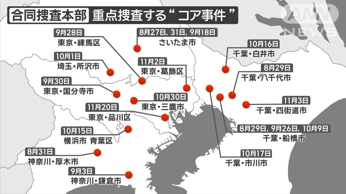 一連の事件について、警視庁、埼玉県警、千葉県警、神奈川県警は合同捜査本部を設置しました。警察庁によると、合同捜査本部が重点的に捜査をしている「コア事件」は19件にのぼります。