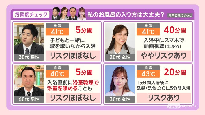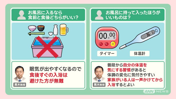 「普段から自分の体温を気にする習慣があると、体調の変化に気付きやすい。家族がいる人は、一声かけてから入浴するとよい」ということです。