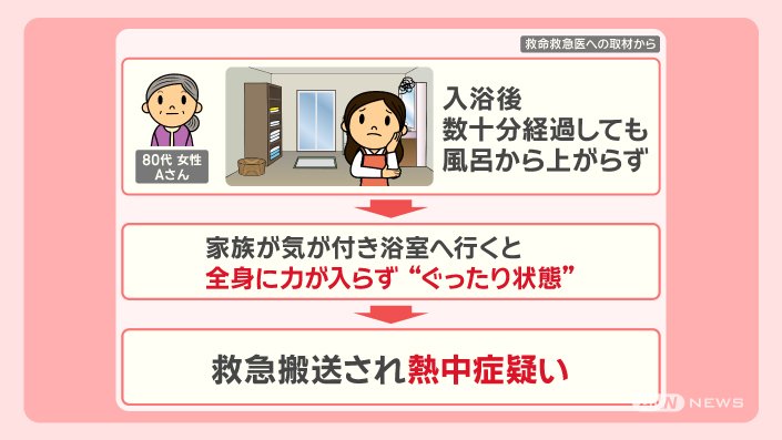家族が気付いて浴室へ行くと、Aさんは全身に力が入らず、ぐったりとした状態でした。その後救急搬送され、熱中症の疑いと診断されました。