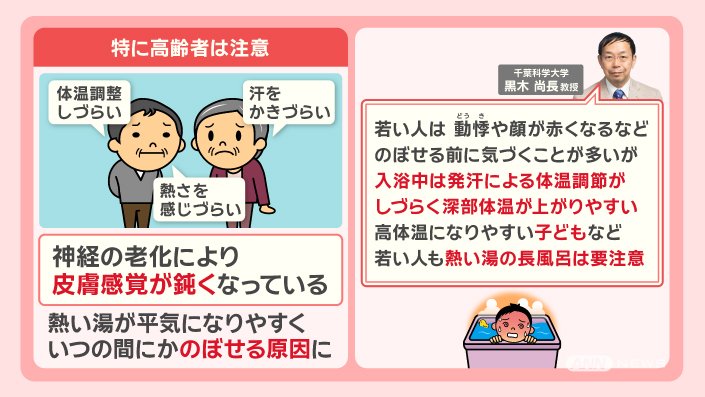 「若い人は、動悸や顔が赤くなるなど、のぼせる前に気づくことが多いが、入浴中は発汗による体温調節がしづらく、深部体温が上がりやすい。高体温になりやすい子どもなど、若い人も熱い湯の長風呂は要注意」ということです。