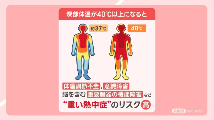 深部体温が40℃以上になると、『体温調節不全』『意識障害』、脳を含む『重要臓器の機能障害』など、『重い熱中症』のリスクが高まります。