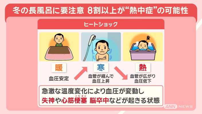 そして、熱い湯船で、血管が広がり、血圧が低下、というように、急激な温度変化により血圧が変動し、失神や心筋梗塞、脳卒中などが起きる状態をヒートショックと言います。